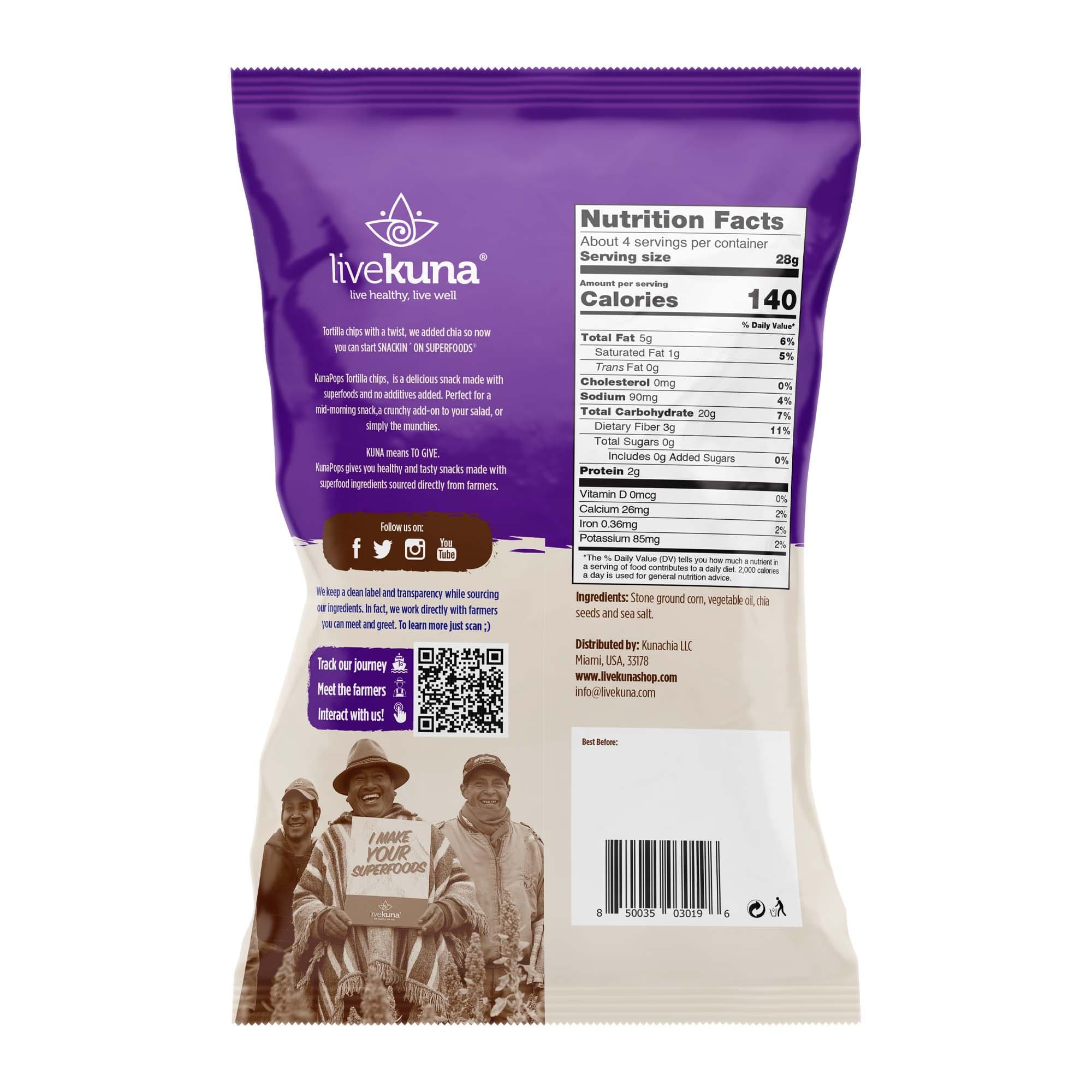 Stone ground corn, Vegetable oil, Chia seeds and Sea salt.